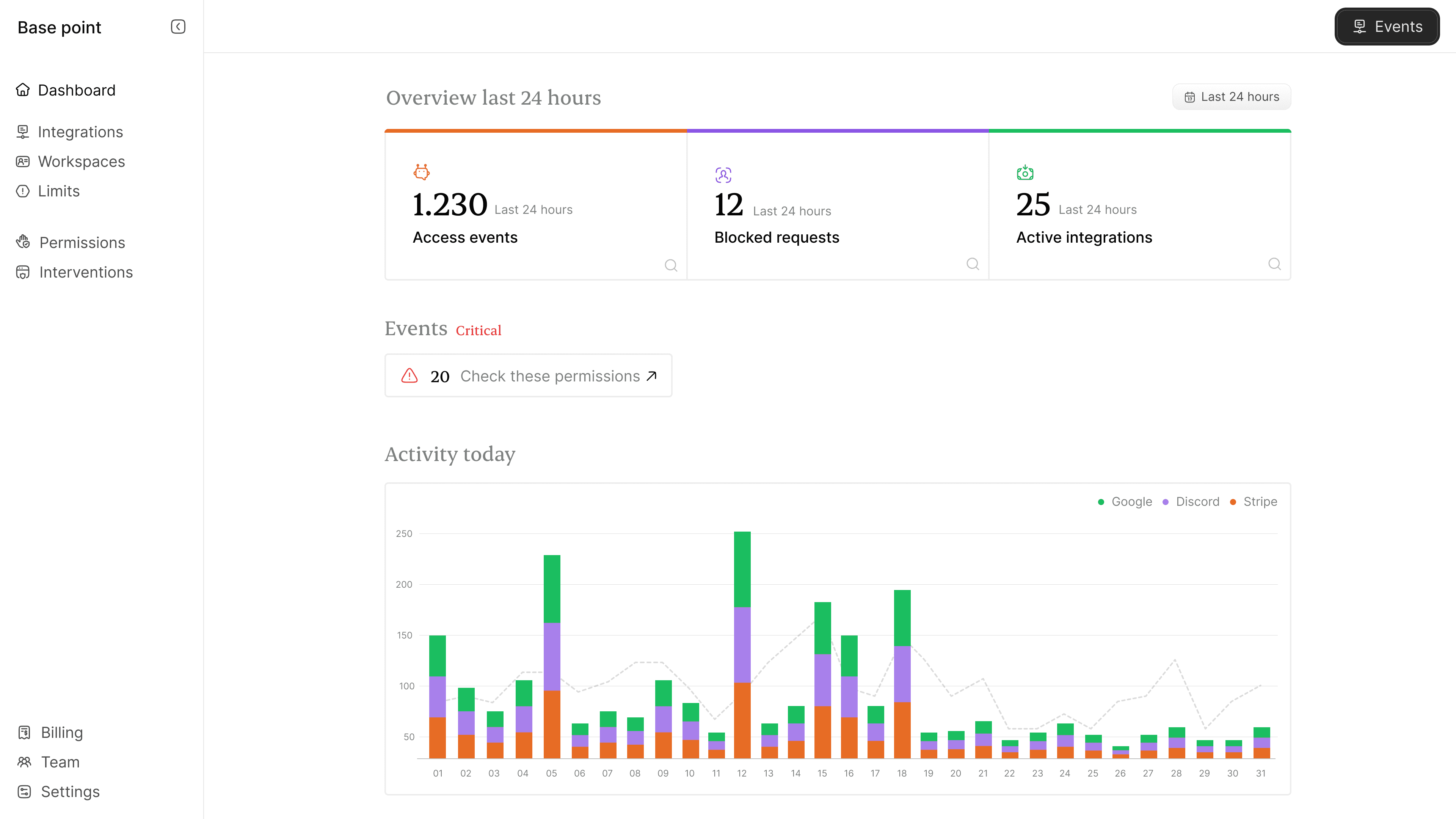 Take your agents to the next level by integrating with over 250 tools and applications, behind a protected base layer. Base Point offers a vast ecosystem of integrations, allowing you to automate tasks, streamline processes, and enhance collaboration across all your platforms and agents.